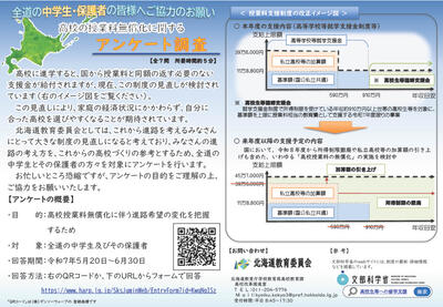 標記の件につきまして、北海道教育委員会から「高校の授業料無償化に関するアンケート調査」のお願いが届いております。保護者の皆様、御協力をお願いします。(5月21日 午後5時に安心メールで配信します。生徒にはクラスルームで配信しています)