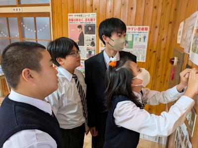 ~職員室前に貼られている小学生の時だった頃の写真を見ている1年生~