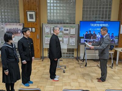 本日11月28日(金)、北海道経済産業局 総務部企画部 企画調査課長 畔木智己 様、企画調査課 総括係長 浜井諒一 様にお越しいただき、『地方創生☆政策アイデアコンテスト作品』の表彰授与式が行われました。今回の賞に関しましては、11月18日のブログで紹介しておりますので、今回は表彰式の様子を写真でご覧ください。
