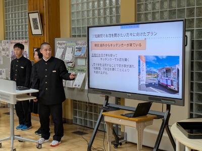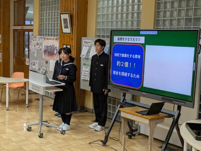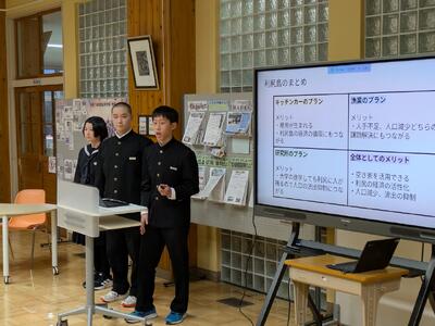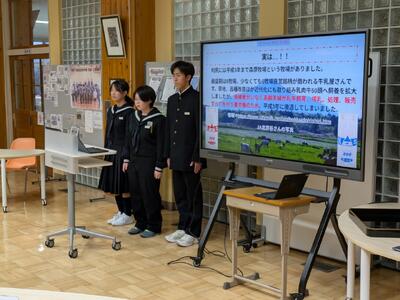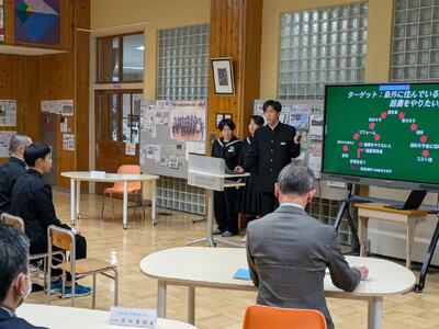 表彰状の授与後、各チームによるプレゼンテーションを実施しました。その後の講評では畔木様より、生徒たちの取り組みに対し、温かいお褒めの言葉を多数頂戴いたしました。浜井様からは、生徒たちのプレゼンテーション能力の高さに驚きと称賛の意をお示しいただきました。この度、生徒たちをこのように多方面からご評価いただき、また、貴重な発表の機会を設けていただきましたこと、心より感謝申し上げます。