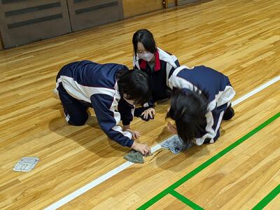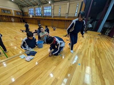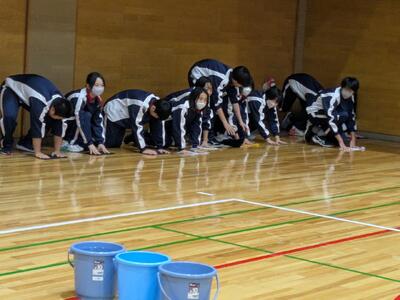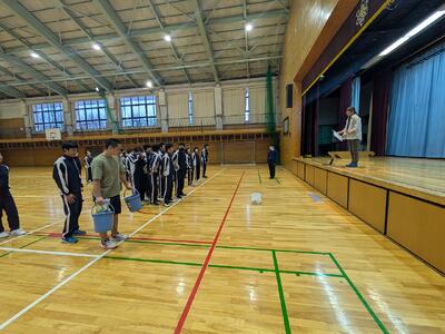 また6時間目終了後、冬休み前清掃を実施しております。冬休み期間中に実施予定の体育館ワックスがけのため、今日は全校で体育館床清掃を実施しています。一生懸命清掃している鴛中生の様子をご覧ください。
