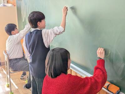 〇キュビナを自主的にしている生徒や担任と似顔絵を書いて遊んでいる1年生