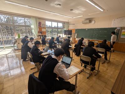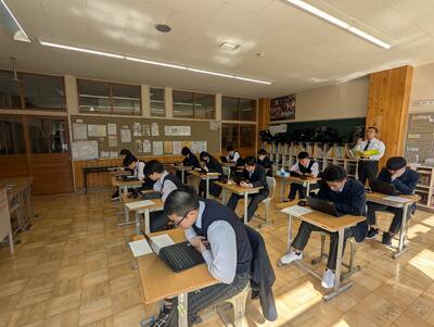 本日は、全国学力・学習状況調査のうち英語の3技能と呼ばれる「読むこと」「聞くこと」「書くこと」の調査と、「生徒質問調査」の2つを行いました。