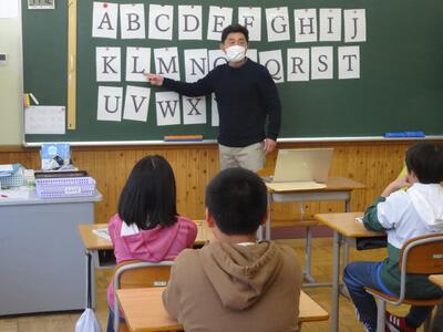 鴛泊地区小中一貫教育の取組の一つとして、中学校教員による乗り入れ授業を実施しています。地域の子どもたちの数学・英語力向上とスムーズな中学校生活への移行を目指しています。