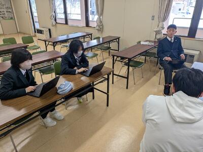 1月29日の入学説明会に向けて、生徒会役員の生徒たちが本日の昼休み、打合せを行っていました。6年生の皆さんに分かりやすく鴛泊中学校のことを知ってもらえるよう、スライドの確認や話し合いを重ねています。