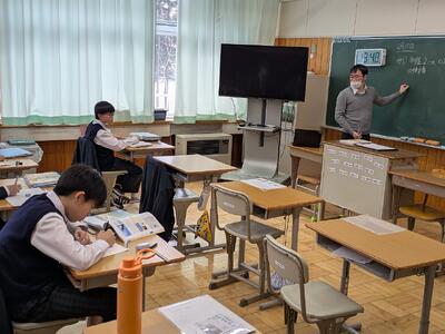 〇5時間目の授業です。1年生:社会 2年生:数学 3年生:理科