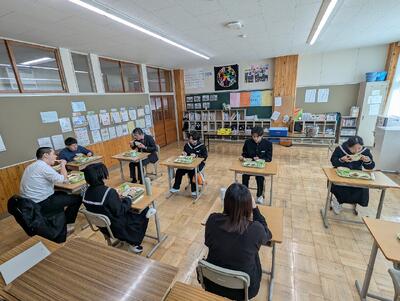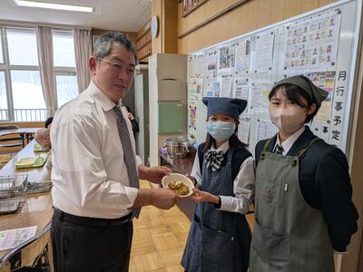 教育長は3年生と一緒に給食を食べました。