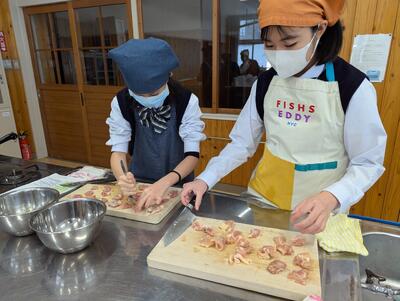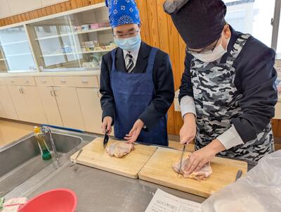 慣れない包丁さばきで鶏肉や長ネギを切る姿にヒヤヒヤしましたが、仲間同士声を掛け合いながら、真剣なまなざしで取り組むことができました。最後の片付けまで協力しながら時間内に終えることができ、素晴らしかったです。