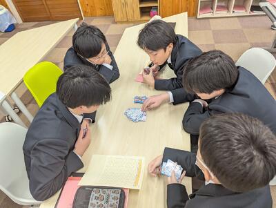 ~2年生英語 「UNO」と「受け身(受動態)」を融合させた授業が行われていました! カードを出す際に、書かれた英文を受け身の形に書き換えて発音するというルールです。教科担当、ALT、そして生徒たちが、笑顔で、でも真剣に英語を使いこなしている姿がとても印象的でした。~