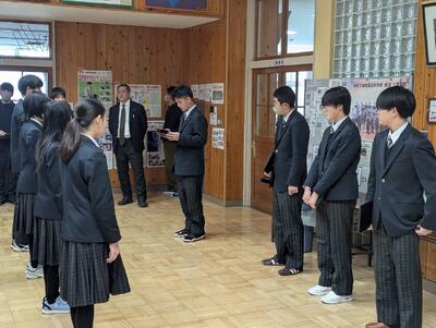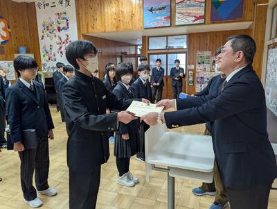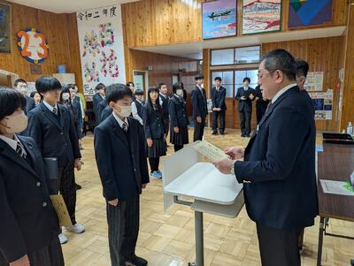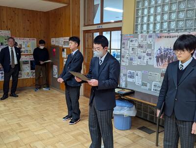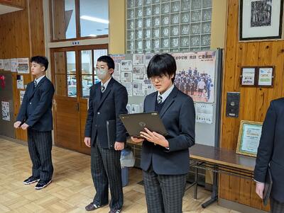 本日3月2日(月)、今年度最後となる全校朝会を行いました。朝会では、先月の反省と今月の目標を全校生徒で確認し合ったほか、宗谷美術展の表彰式も執り行われ、生徒たちの頑張りを称えました。